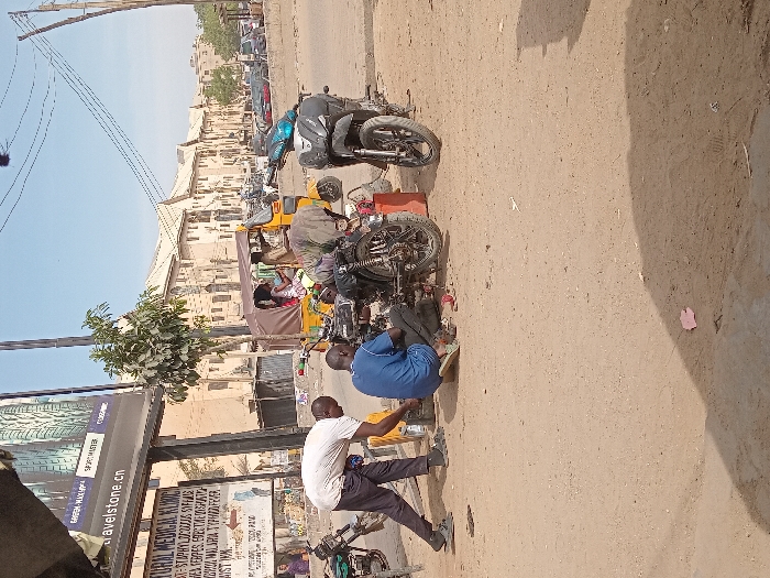 An outdoor scene in Sabon Gari East, Nigeria, depicts an unpaved area adjacent to a paved road under a clear blue sky