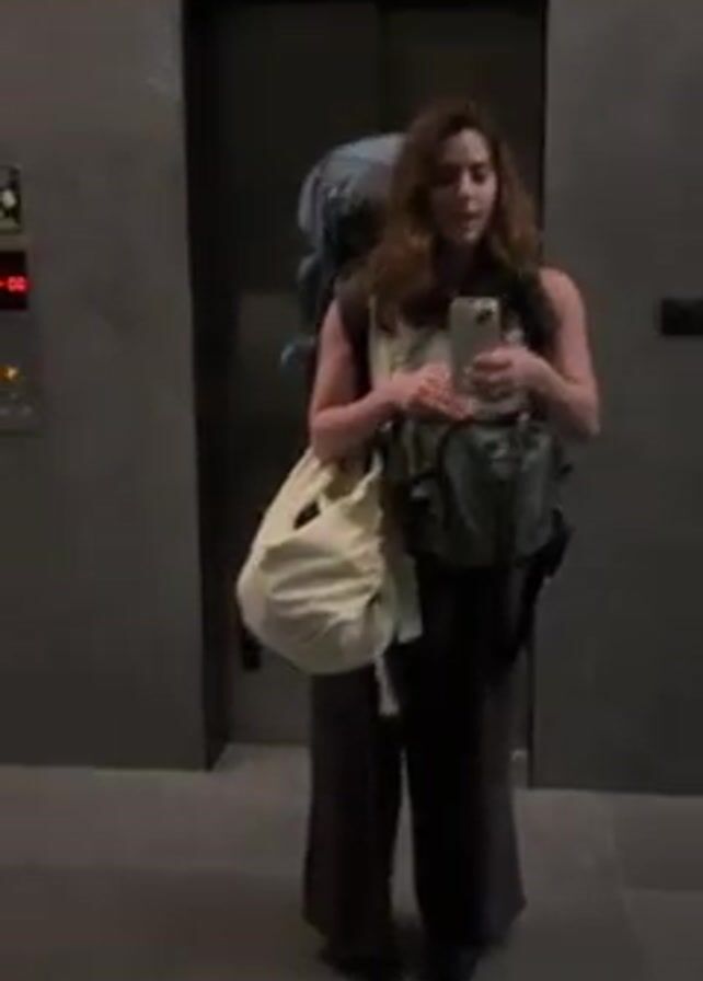 In an indoor shot, a woman is standing in front of a mirrored wall next to an elevator. The woman is fair-skinned, with curly brown hair and is facing the camera. She is holding a phone in her hands and looking at it, as if taking a selfie. She is heavily laden with bags: a large backpack, a smaller green bag on her chest, and a cream-colored tote bag hanging off one shoulder. She's wearing a white tank top and baggy brown pants, with dark shoes. The elevator is closed, with a panel of buttons visible to the side. Above the elevator doors, there is a sign written in Hebrew. The wall behind the woman and the elevator is smooth and gray with a marble pattern.