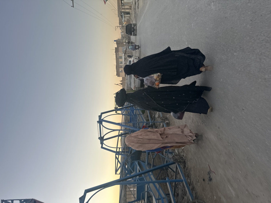 Three women walk on a street. Two wear black abayas, one carries a bag of oranges. A third woman is wrapped in tan-colored fabric. A blue metal structure is along the sidewalk near them. Cars and motorbikes are on the street behind them, and buildings are visible in the distance. The sky is pale blue, transitioning to orange near the horizon. The image has been rotated counterclockwise.