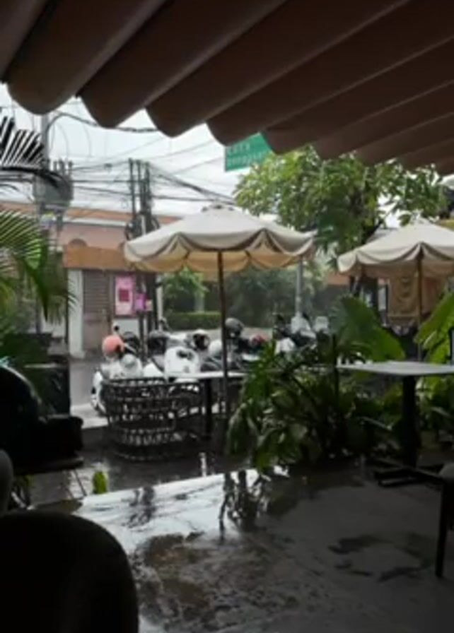 rainy outdoor setting under a cream-colored awning. In the foreground, there's a dark chair. The patio area has standing water on the concrete. Underneath umbrellas, there are tables, chairs, and potted plants. In the background, several parked motorbikes are visible, as well as buildings, trees, and overhead power lines. A street sign can be partially seen.