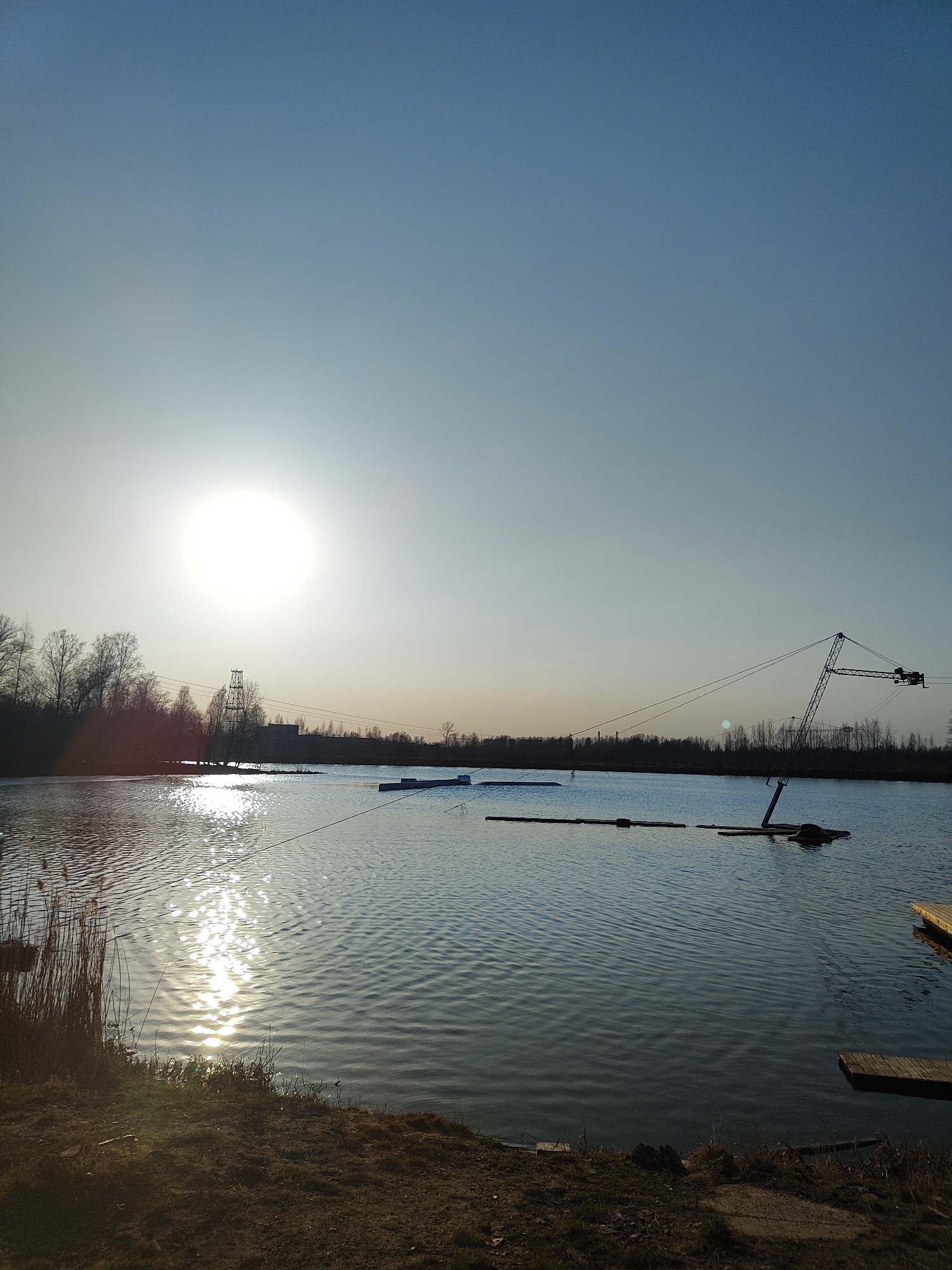 The image depicts a body of water, likely a lake or large pond, with various structures and equipment related to water sports. The sun is high in the sky, casting a bright reflection on the water's surface. On the water, there are several floating obstacles, possibly used for wakeboarding or similar activities. A cable system is visible, supported by a crane-like structure on the right side of the frame. The shoreline is visible in the foreground, with vegetation and a small section of dock. Trees line the horizon in the background, suggesting a park or wooded area surrounding the water. The location is in the city of Unknown, Unknown.