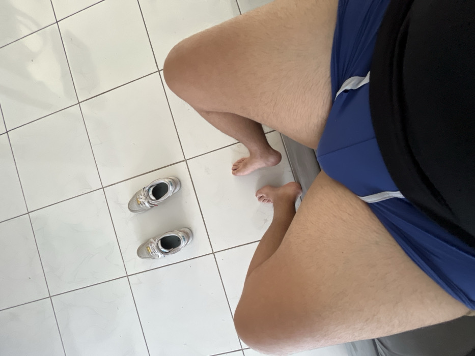 The image depicts a first-person, downward-looking view from a seated or reclining position within a residence in Arica, Chile. The individual's lower torso and upper legs are visible in the foreground, wearing blue athletic shorts with white trim and a black shirt. The individual's bare feet are positioned on a light-colored surface immediately in front. To the right of the primary subject's feet, a second pair of bare feet is visible, suggesting another person is also present or was recently present in the immediate vicinity. On the white tiled floor, accented with dark grout lines, a pair of light-colored sneakers with white laces are placed side-by-side, oriented towards the bottom of the frame. The environment is characterized by bright, even lighting, indicative of an indoor setting.