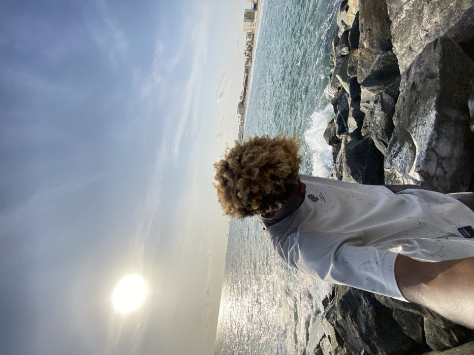 A person with curly, light brown hair stands near a rocky shoreline facing the ocean. They wear a light-colored shirt with subtle patterns. The sea is visible, reflecting the sunlight. In the distance, buildings line the shore. The sky is partly cloudy, with the sun appearing bright. Rocks are positioned to the right of the person.