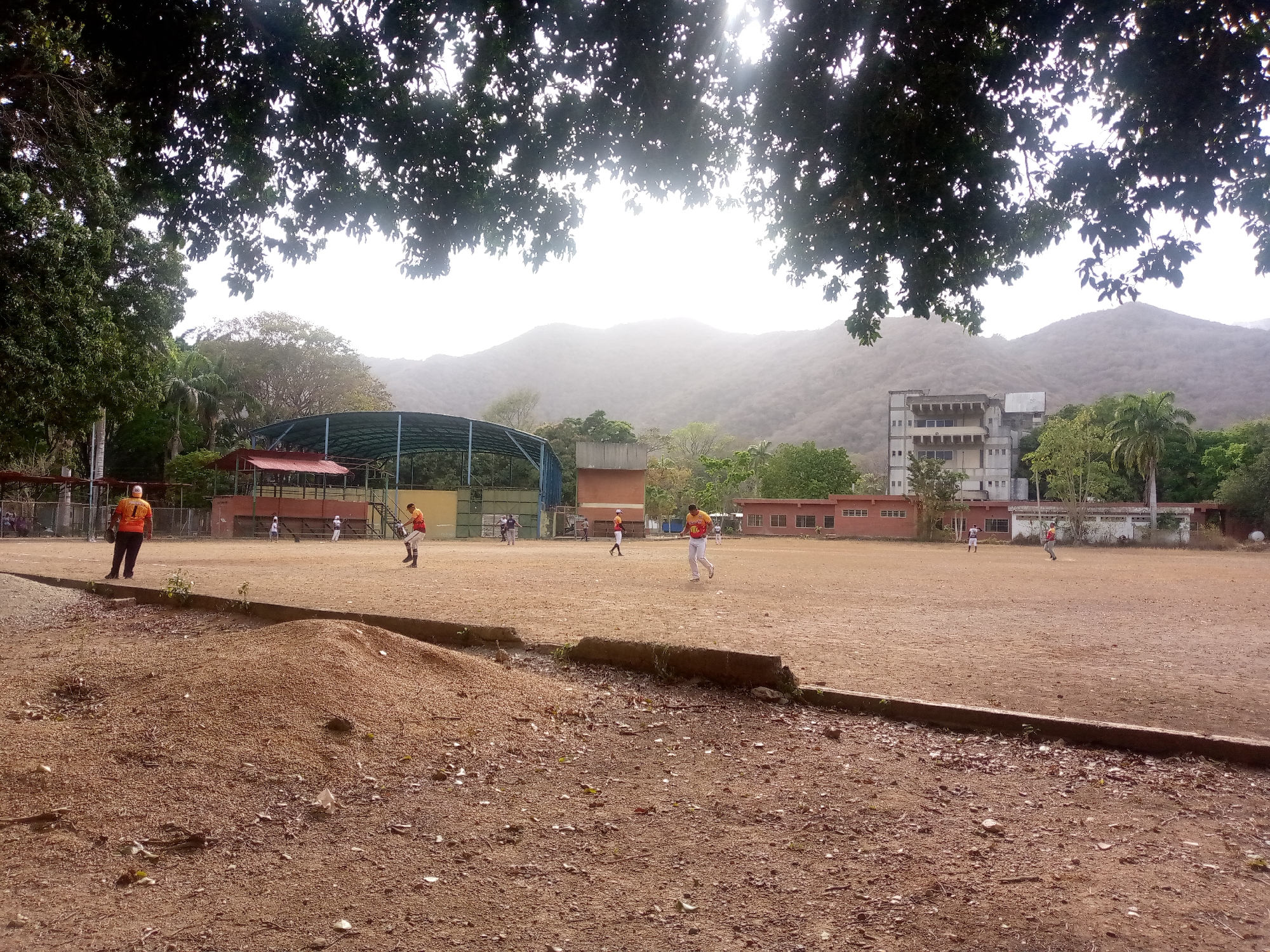 The image depicts a baseball field in what is likely Las Piedras, Venezuela. Several individuals are scattered across the dirt field, some wearing orange jerseys. A concrete dugout and buildings are visible in the background, along with hills in the distance. The foreground shows a dirt patch strewn with pebbles and debris. Overhanging branches frame the top of the image.