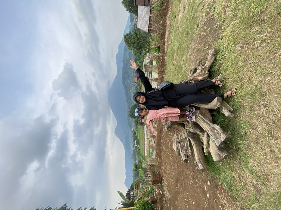 The image captures an outdoor scene in Trawas, Indonesia, featuring two individuals posing on a large, weathered tree stump. An adult female, dressed in a black hijab, black long-sleeved top, black trousers, and black strappy sandals, is seated on the right side of the stump. She wears a black shoulder bag with a silver chain strap and extends her left arm outwards, palm open, while smiling at the camera. Standing to her left on the stump is a young female child, wearing a light pink short-sleeved dress, dark athletic shoes with pink accents, and a light blue bow in her hair. Her arms are extended outwards, mirroring the adult, and she looks directly at the camera. The foreground consists of exposed brown soil interspersed with patchy green grass. The midground reveals terraced agricultural fields, likely rice paddies, dotted with scattered rural buildings featuring reddish-brown roofs, all set amidst lush green vegetation. The background is dominated by a prominent mountain range, consistent with Mount Penanggungan, under a cloudy, overcast sky, with some atmospheric haze obscuring the distant peaks. Sparse bamboo stalks are visible on the far left of the frame.