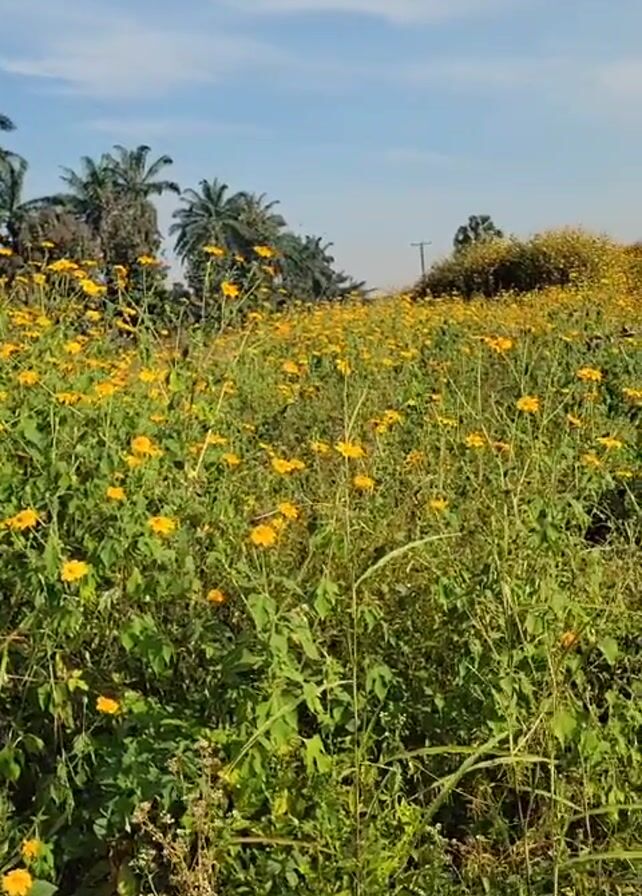 field full of yellow flowers under a blue sky with scattered clouds. Palm trees are visible in the background. The flowers are densely packed and appear to be in full bloom. Some taller grasses and weeds are interspersed among the flowers. The scene is bright and sunny.