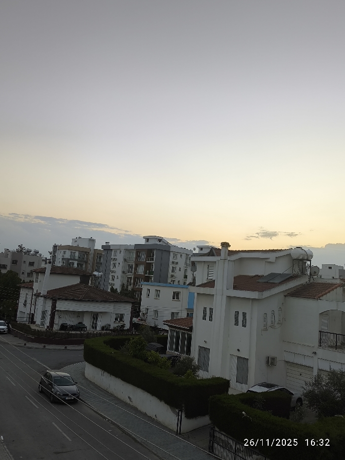 An elevated view captures a residential area in North Nicosia, Northern Cyprus / Cyprus, during late afternoon twilight on 26/11/2025 at 16:32