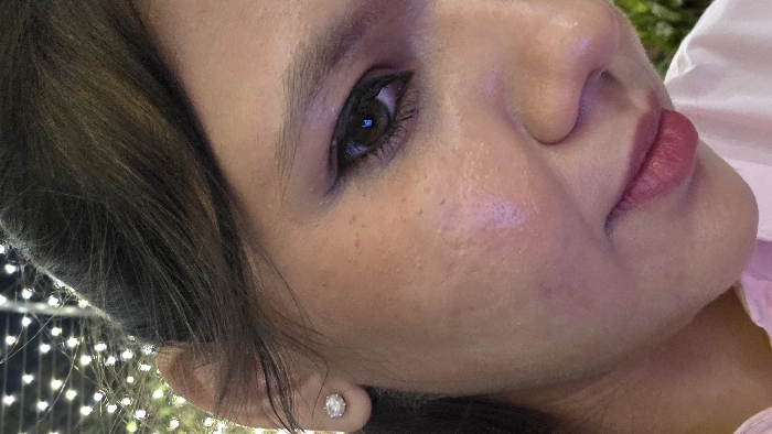 A close-up, angled shot focuses on the right side of a female individual's face, captured likely in the evening or night