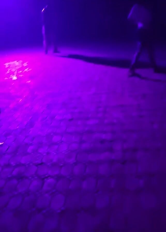 Two figures are seen walking across a patio paved with interlocking hexagonal tiles, lit by changing colored lights