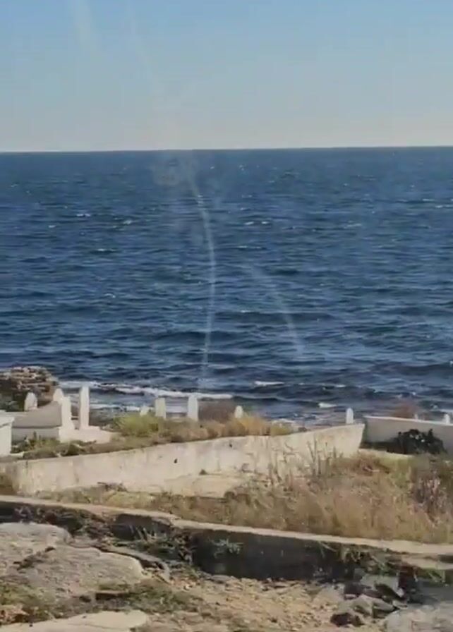 view of the ocean from a moving vehicle. In the foreground is a cemetery with white tombs. A palm tree is partially visible in the frame. The ocean is blue with small waves. The sky is clear and blue. There are some rocks and vegetation near the shore. The view is seen through a window, as evidenced by reflections on the glass.