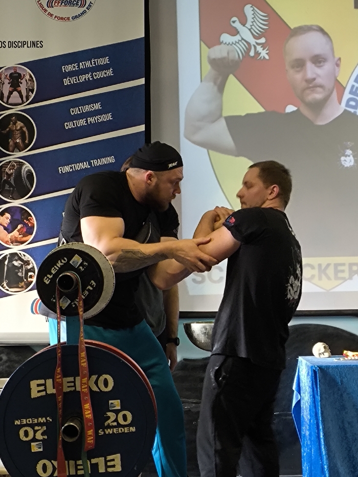 The scene depicts an indoor environment in Woippy, France, featuring two adult males engaged in a physical interaction, likely instructional, related to strength sports