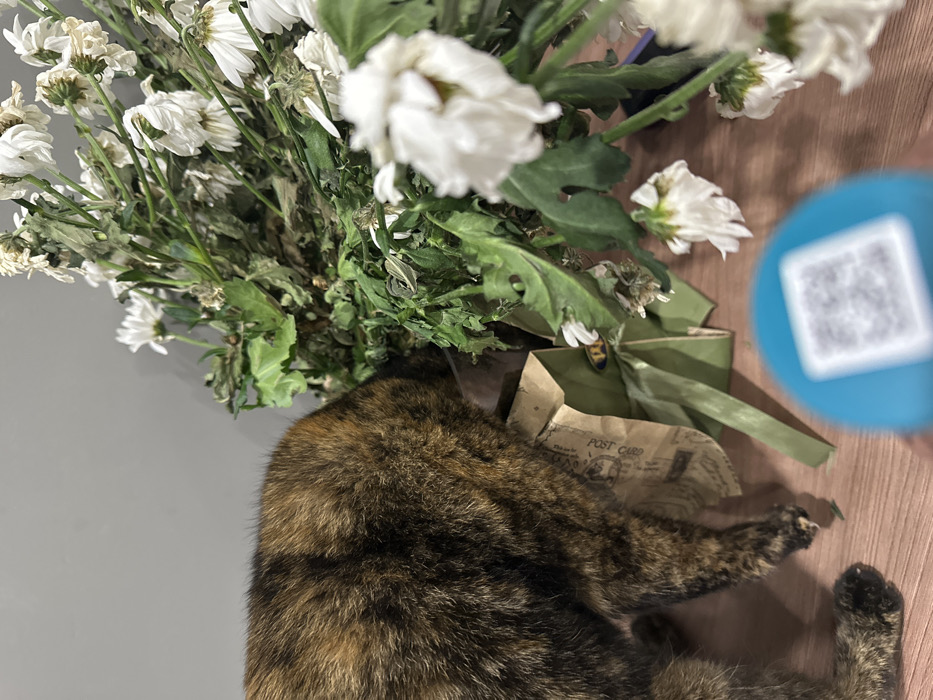 A tortoiseshell cat lies beneath a bouquet of fading white flowers. A brown paper package tied with green ribbon sits nearby, partially covered by the cat. The package has a printed image of a postcard. A blue object with a QR code on it is visible in the upper right corner. The scene appears to be on a wooden surface next to a light gray wall.