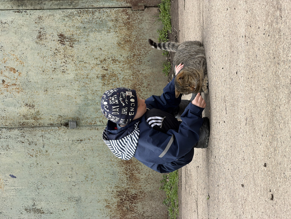 In the city of Beryozovy, Russia, a young child in a dark blue hooded jacket, black pants with white stripes, and a dark beanie with white text ("ENJOY YOUR DAY") crouches on a light grey concrete surface. The child's left hand gently strokes the head and back of a brown and grey tabby cat, which is lying relaxed on the ground. The child's right hand is also extended towards the cat's head. The immediate background is dominated by a weathered, tall metal wall or garage door exhibiting significant rust and peeling light green/blue paint. Sparse green vegetation grows along the base of this wall.