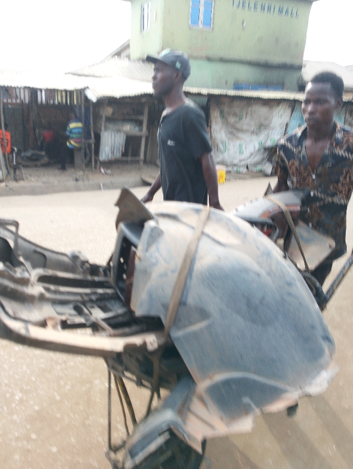 Two men transport damaged motorcycle parts on a wheeled contraption