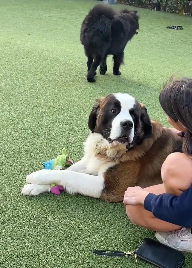 dog park. A woman in a navy blue sweatshirt and black shorts sits on artificial turf, petting a large Saint Bernard dog. The dog is lying down, with a plush toy under its front paws. An Akita dog stands to the left of the woman, looking at the Saint Bernard. In the background, a black fluffy dog walks away, and a man stands near a tan-colored dog near a hedge. There is a black clutch purse on the ground. Buildings are visible in the background.