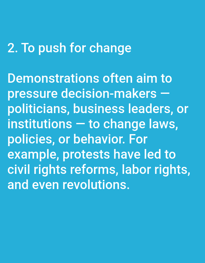 The image displays white sans-serif text against a uniform teal background. The text begins with "2. To push for change" on the top left, followed by a paragraph centered below it: "Demonstrations often aim to pressure decision-makers — politicians, business leaders, or institutions — to change laws, policies, or behavior. For example, protests have led to civil rights reforms, labor rights, and even revolutions." No people, subjects, objects, actions, or interactions are depicted. The environment is an abstract digital display of text; no specific geographical location in the city of Unknown, Unknown, or any other city, is shown.