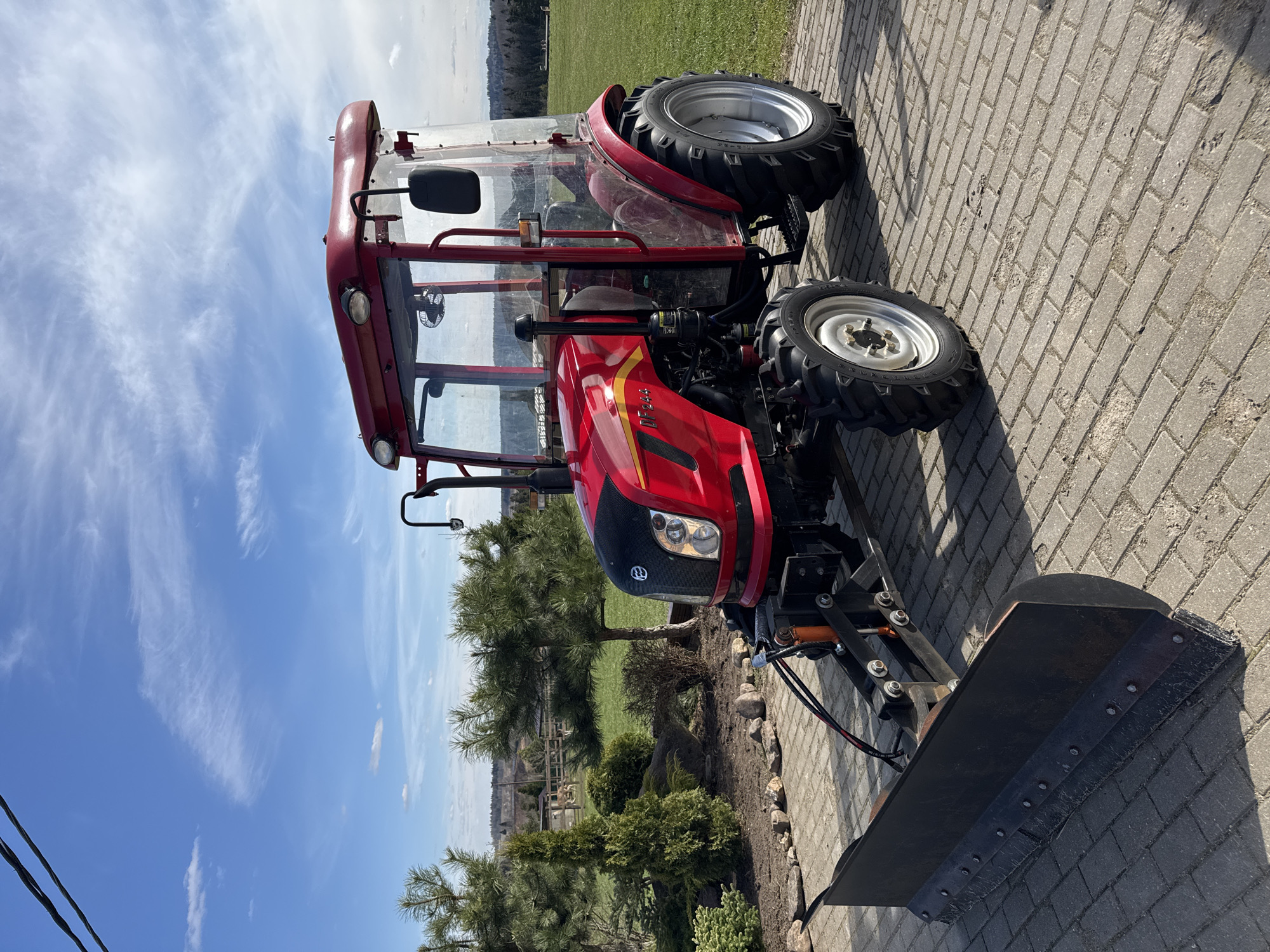 The image depicts a red tractor with a front-mounted blade parked on a paved surface of gray bricks
