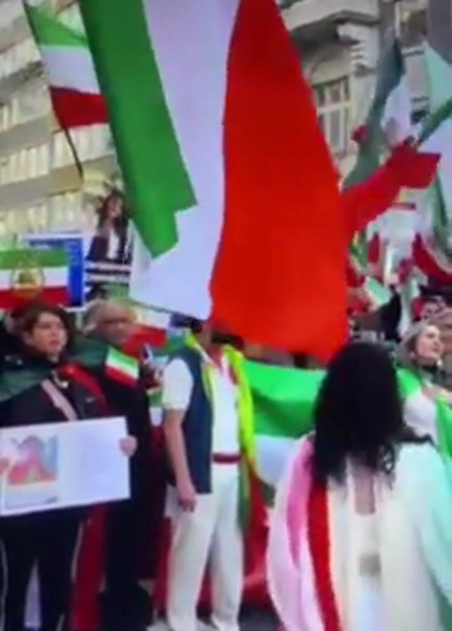 A crowd of people are protesting in a street. They are holding Iranian flags and signs. A woman is speaking into a microphone. The people are chanting. Buildings are visible in the background.