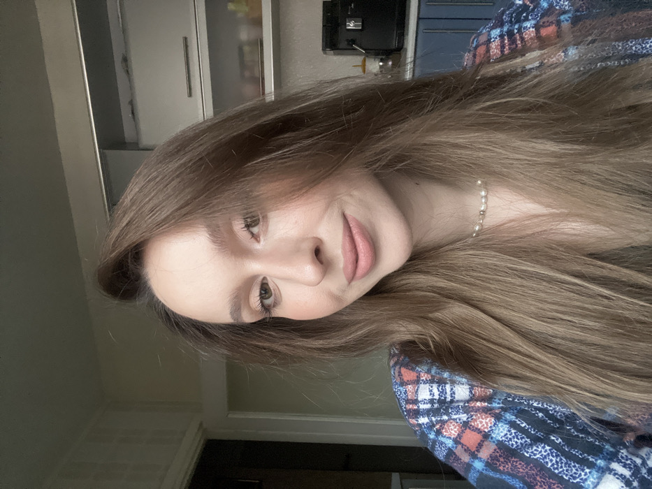 A photograph depicts a single female subject, presented from the chest up, looking directly at the camera with a slight smile. The subject has long, light brown hair, brown eyes, and fair skin, with visible subtle makeup including mascara, eyeliner, and light pink lip color. She is wearing a plaid shirt featuring blue, orange, and white patterns, and a necklace composed of pearls interspersed with darker, possibly metallic, beads. The immediate background on the left side displays a light-colored wall with faint textured wallpaper and an open doorway leading to an indistinct darker interior where a framed object is partially visible. The background on the right side identifies a domestic kitchen or utility space, featuring light grey overhead cabinets; the rightmost cabinet has a transparent or frosted door revealing internal items. Below these cabinets, a dark blue or grey paneled backsplash is visible above a countertop where a black coffee machine and a light-colored cup with a yellow lid and straw are situated. No specific landmarks or identifying features are present within the image to ascertain a precise location within the city of Minsk, Belarus; however, the scene is confirmed as a residential interior.