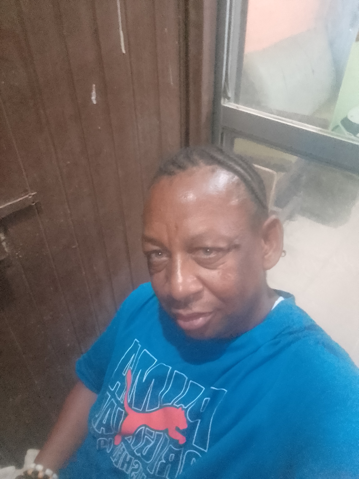 A medium indoor shot features a Black male sitting, wearing a blue Puma t-shirt. He has short braided hair and a small earring in his left ear. He appears to be in a residential setting. Behind him is a wooden wall and a window, likely of domestic origin, with indistinct objects visible through it. This photo was taken in Narayi, Nigeria.