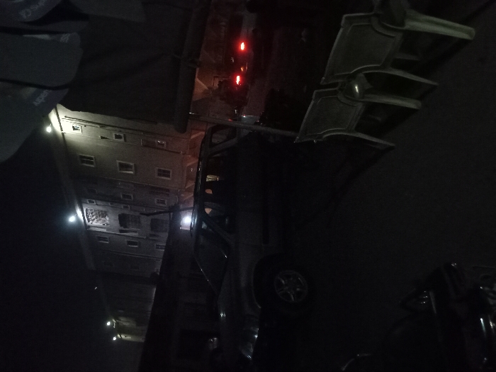 A nighttime street scene features a tall building lit by evenly spaced streetlights. A car is parked along the curb. A traffic light shows a red signal. A scooter or moped sits nearby, its details obscured by the darkness. The overall scene is dimly lit, with a strong contrast between the illuminated areas and the surrounding shadows.