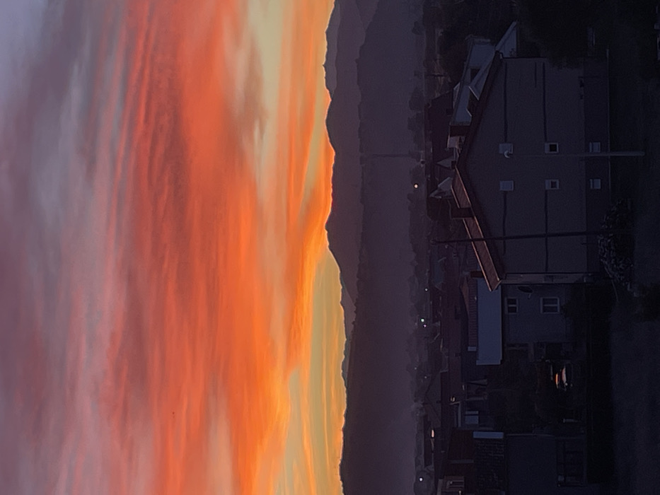 An elevated view captures a sunset or sunrise over the city of Podgorica, Montenegro, with a mountainous backdrop. The upper two-thirds of the frame are dominated by a sky displaying vibrant hues of orange and red, transitioning to a lighter yellow-orange closer to the horizon line, and fading to a purplish-grey at the very top. Horizontal cloud streaks are visible across the colored sky. A dark, silhouetted mountain range forms a jagged horizon line beneath the colorful sky. Below the mountains, the city's residential areas are visible, shrouded in deep shadows. The buildings are primarily two to three stories high, featuring sloped, reddish-brown tiled roofs. In the mid-ground, a prominent two-story building with a hip roof and light-colored facade (appearing dark due to lighting) is visible to the right of center. A utility pole stands directly in front of this building. To its left, another building shows rectangular windows. Scattered throughout the urban landscape, faint artificial lights are visible as small, bright points. A tall, slender structure, possibly a chimney or communication tower, rises in the distant urban area, silhouetted against the lower part of the sky. No individuals or active vehicles are discernible. The immediate foreground is dark and indistinct, showing some vegetation and possibly construction materials near the prominent building. The overall scene is characterized by deep shadows across the urban and natural landscape, contrasting sharply with the illuminated sky.