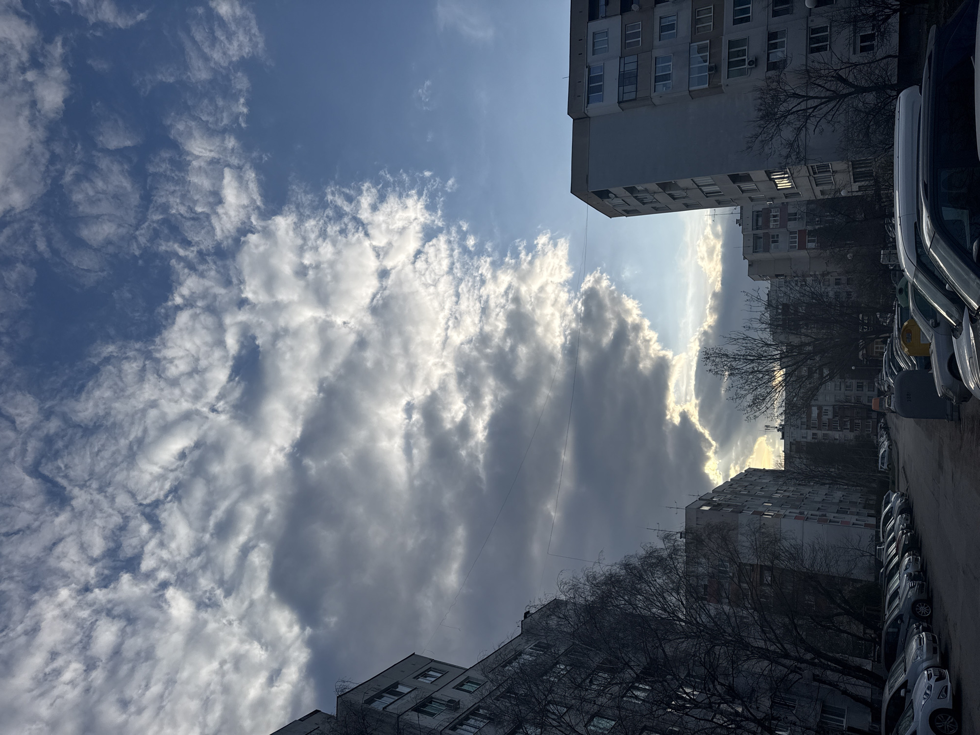 The image displays an urban residential street and adjacent parking areas in Sofia, Bulgaria, under a mixed sky. The upper portion of the frame features a dynamic sky with dense, textured grey and white clouds on the left, showing bright sunlight breaking through their edges and gaps. This transitions to a clear blue sky with lighter, wispy clouds towards the upper right. Multiple multi-story concrete residential apartment blocks, characteristic of Eastern European architecture, define the environment. On the left, a light grey building, approximately 8-10 stories high, angles upwards from the lower left, presenting numerous windows, some with visible air conditioning units. On the right, another similar light grey residential building, also multi-story, stands vertically with multiple windows and a darker band at its upper edge. Other identical residential blocks are visible in the background, forming a dense urban fabric. Numerous deciduous trees, bare of leaves, are scattered throughout the scene, with their skeletal branches silhouetted against the sky and buildings, indicating a cold season. The ground level consists of a paved surface occupied by a dense arrangement of parked passenger vehicles, including sedans and hatchbacks of various colors, extending from the foreground into the mid-ground. Urban elements such as a partially visible yellow waste bin and a dark grey bollard are present on the right. No individuals are visible within the frame. The lighting suggests either late afternoon or early morning, with strong contrasts between the sunlit clouds and shadowed foreground elements.