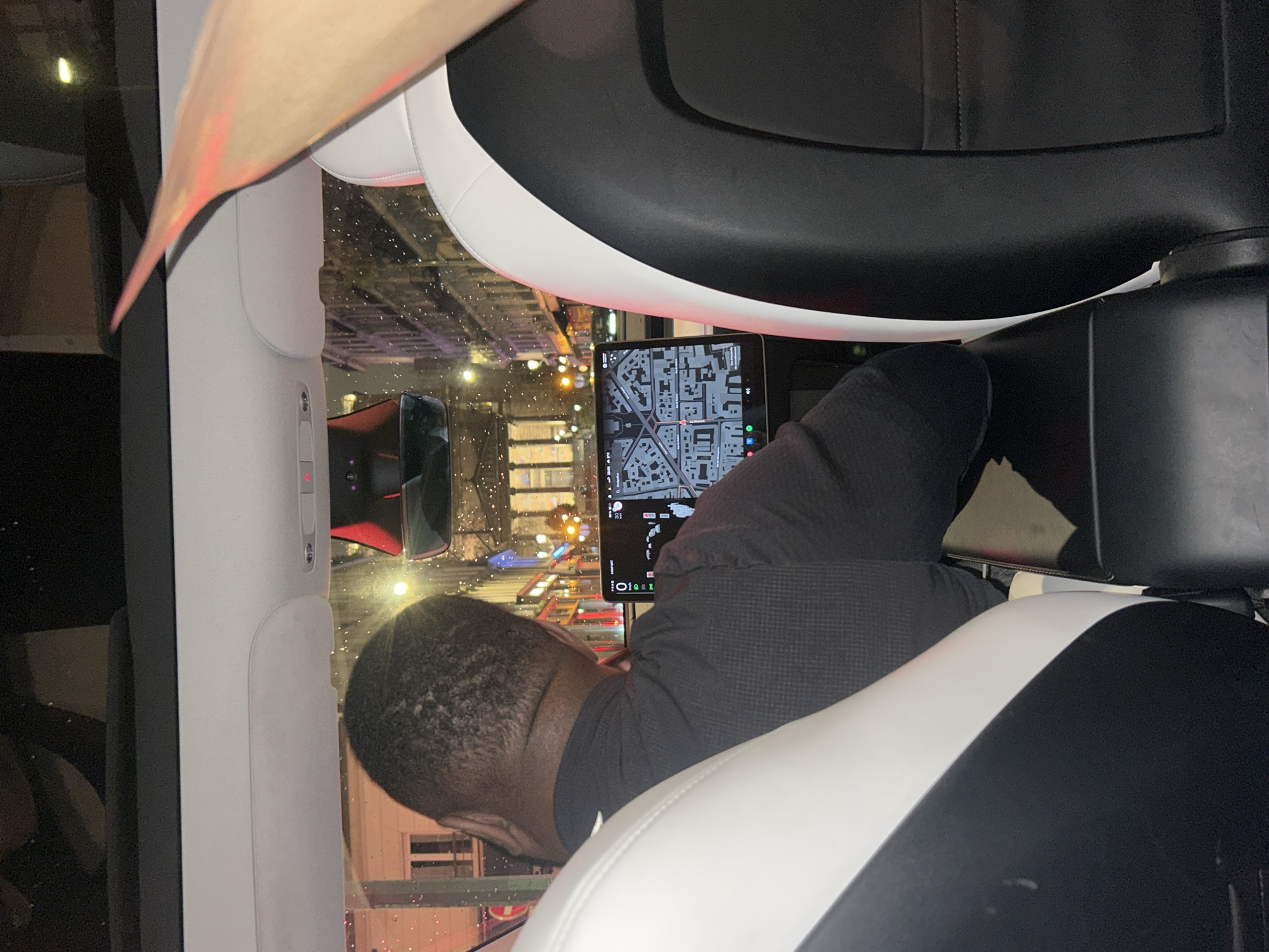 A person is sitting in the backseat of a car looking at a digital map. It is night, and there are lights visible outside.