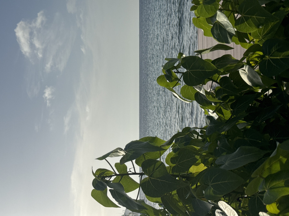 The image displays a daytime coastal scene in San Miguel de Cozumel, Mexico. The foreground is occupied by a dense arrangement of vibrant green tropical foliage featuring large, heart-shaped leaves, some illuminated by direct sunlight creating highlights, while others remain in shadow. Behind the foliage, the calm, blue-green expanse of the Caribbean Sea extends horizontally, displaying minor surface ripples, to meet a distinct horizon line. The sky above is light blue with scattered white cumulus clouds. On the far left, a portion of a light-colored, possibly white, vertical structure is partially visible behind the foliage. On the right side of the mid-ground, a section of light-toned wooden decking, composed of parallel planks, is discernible near the water's edge. No individuals or active subjects are present.