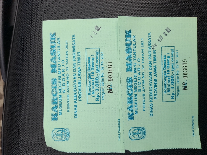 two green tickets for entry into the Museum Negeri MPU Tantular Sidoarjo in Kecamatan Sidoarjo, Indonesia