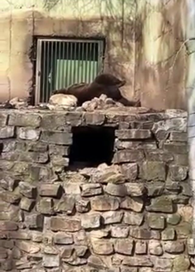 A brown bear lies on a stone structure under a barred window