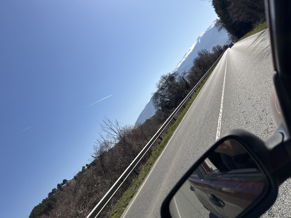 This image displays a view from inside a vehicle on a rural mountainous road in Blatino, Bulgaria