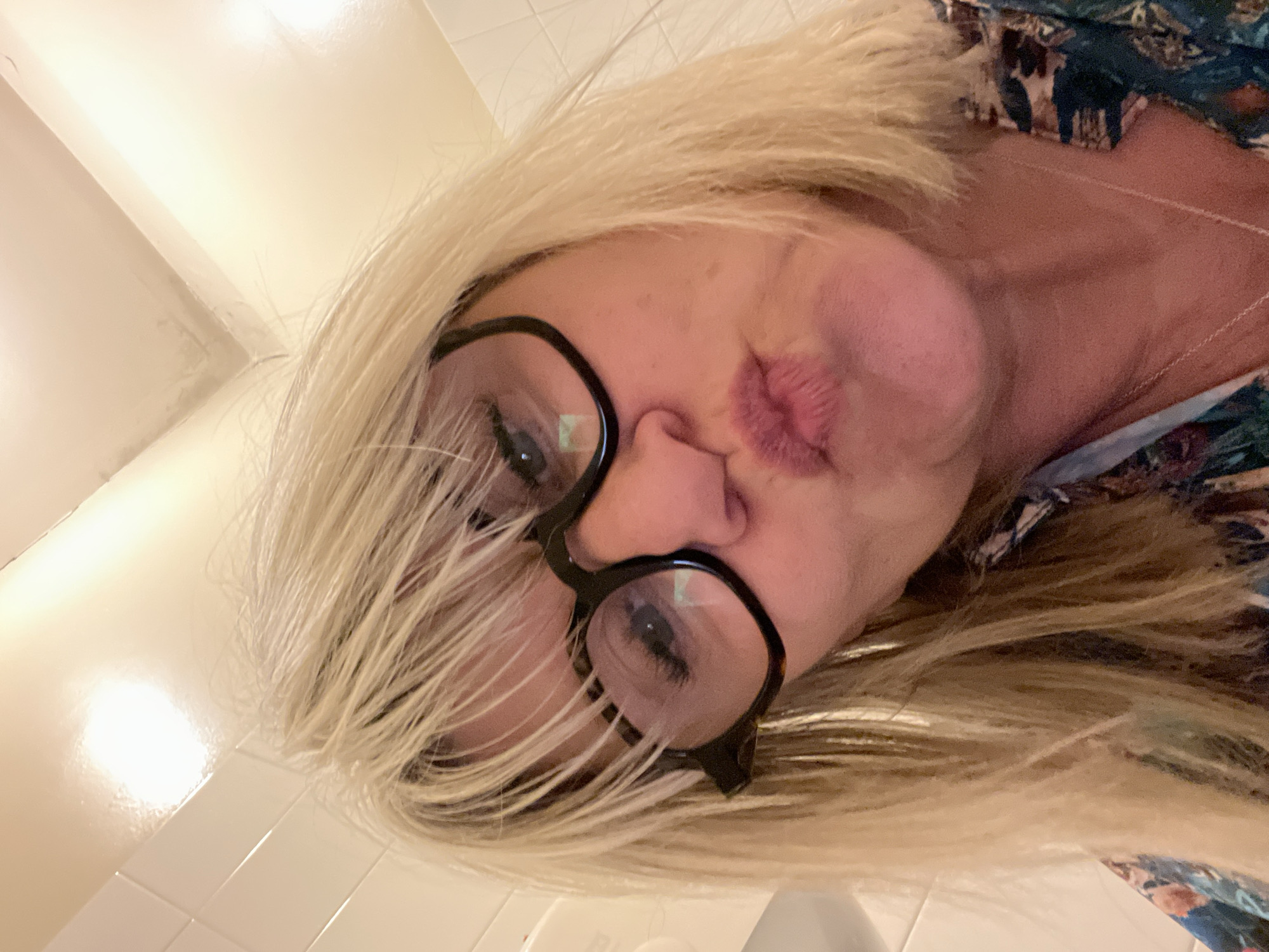 An upward-angled, close-up selfie-style photograph depicts a Caucasian female with blonde hair and black-framed glasses, positioned within an indoor environment in La Fouillouse, France. Her head is tilted, and her facial expression shows puckered lips, indicating a "kissing" pose. A bright light source is visible above her left temple and reflects as a square in her right eyeglass lens. She is wearing a dark, multi-patterned shirt, possibly floral. The background consists of a light-colored, possibly off-white, tiled wall on the left, with visible grout lines, and a smooth wall transitioning into a ceiling corner on the right.