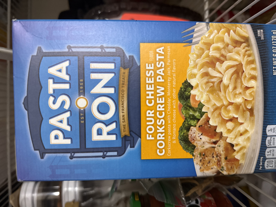 - "This image displays the front of a vertically oriented Pasta Roni brand food product box, specifically "FOUR CHEESE FLAVOR CORKSCREW PASTA," situated on a white wire shelf in a storage area within Grayson, United States" by FM-AodXs2, licensed under CC BY 4.0