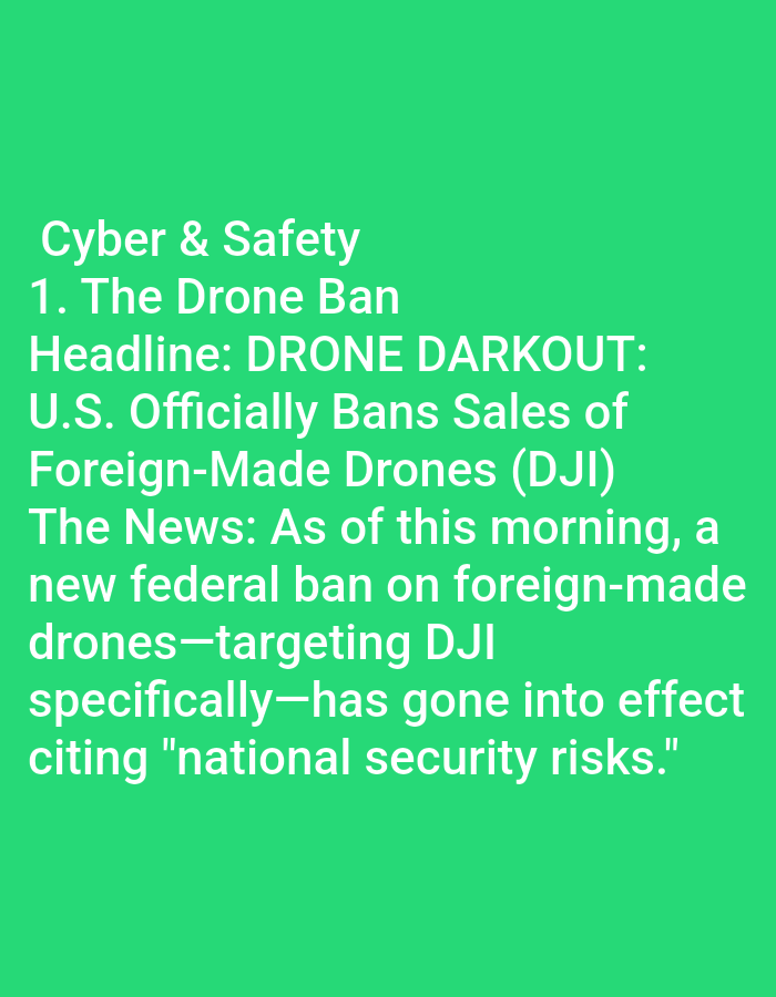 The image presents a news item titled "Cyber & Safety," specifically addressing "The Drone Ban." The headline reads "DRONE DARKOUT: U.S. Officially Bans Sales of Foreign-Made Drones (DJI)." The news section elaborates, stating that a new federal ban on foreign-made drones, targeting DJI specifically, has gone into effect, citing "national security risks."