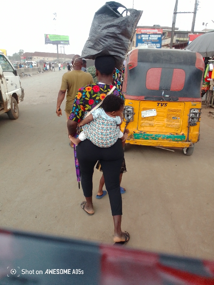 This image depicts a bustling street scene in Onitsha, Nigeria. The foreground is dominated by the back of a woman walking forward, carrying a large, dark grey/black bag on her head and a baby in a patterned carrier strapped to her back. She wears a black shirt with a vibrant floral pattern and black leggings with sandals. To her right, partially obscured, is another person wearing blue slip-on shoes. Immediately in front of her, a man in a light brown short-sleeved shirt and dark trousers walks, also viewed from behind, holding a small dark object in his right hand. To the immediate right of the woman is a stationary yellow TVS-branded tricycle (keke Napep) with red accents on its canopy, displaying a partially visible Anambra state license plate. On the left side of the frame, a white panel van with an open or missing driver's side door is visible. The street itself appears to be unpaved or heavily worn, with a light brown, dusty surface. In the mid-ground and background, numerous pedestrians populate the street. Various buildings and structures line the road. Two large billboards are prominent: one on the left advertises "Bet9ja" and "BOOSTED ODDS," while another on the right promotes "BRIGHT TOMORROW MASS TRANSIT" services to destinations including "CALABAR, UYO, OWERRI, ABA," indicating a major transport route or hub. Overhead power lines or communication cables are visible against an overcast sky. An umbrella or canopy is partially visible on the far right, suggesting a nearby stall or market activity. The bottom left corner contains a "Shot on AWESOME A05s" watermark.