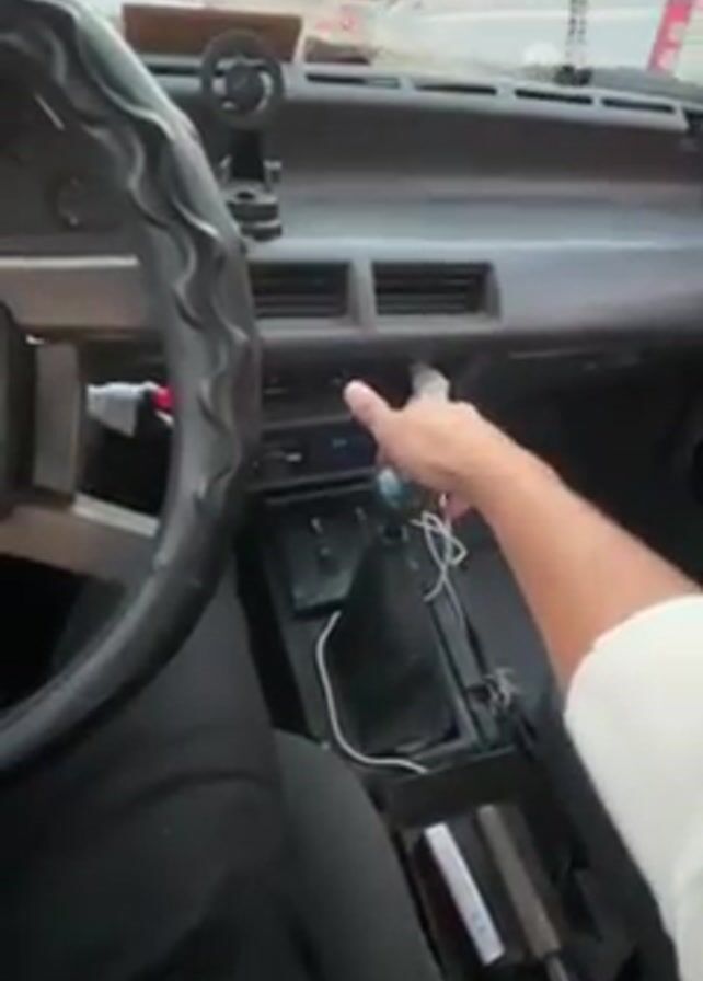 interior of an older model car. A person wearing black pants and a white shirt is driving. The person shifts the gear stick twice while behind the steering wheel. The dashboard is gray with air vents and a car radio. A mobile phone charging cable is plugged into the car’s electrical system. A decorative eagle pendant hangs from the rearview mirror. The car appears to be stopped at a light, as other cars are visible through the windshield. The sound of a car horn can be heard in the background.