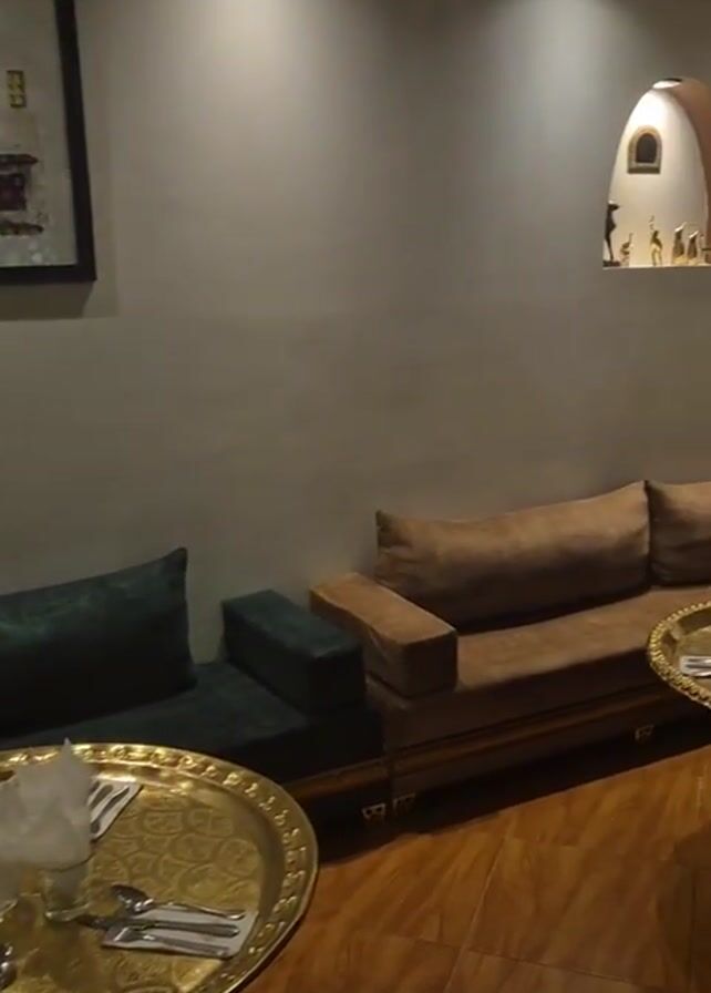 The video showcases the interior of a Moroccan-themed lounge. The room features low-set sofas upholstered in varying shades of brown and green, arranged around a series of ornately decorated brass tables laid out with silverware and napkins. The decor is detailed, including traditional Moroccan lamps and recessed wall niches displaying figurines and artifacts. The room appears to be set up for dining or lounging.