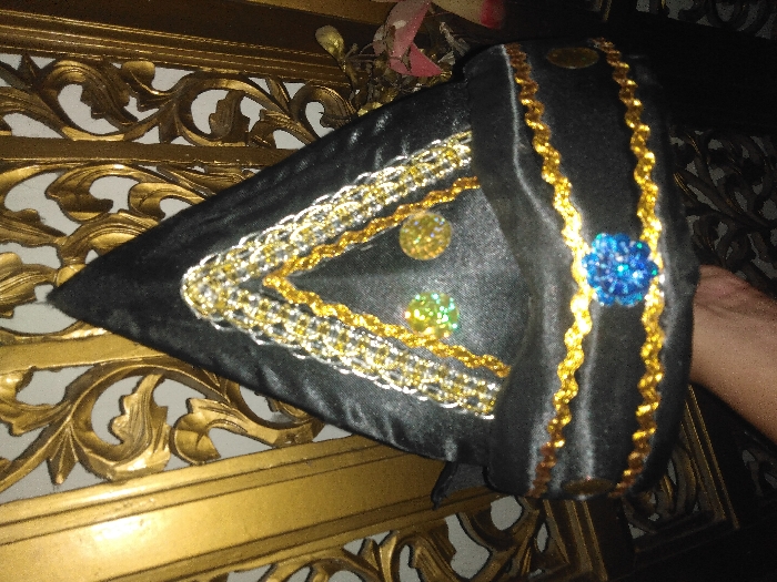 A human hand with light skin tone holds a black, conical fabric cap upwards. The cap features intricate decoration. Its upper front displays two inverted 'V' or 'A' shaped patterns composed of interwoven gold and silver braided cords. Below these, two circular, multifaceted, reflective embellishments are visible; one is greenish-yellow, the other yellow. The cap's lower band is adorned with two horizontal, wavy gold trim lines, between which a prominent, multifaceted, reflective blue gem is centrally placed. Two small, dull, circular gold-colored objects are positioned on the far right of this lower band. The background consists of an ornate, three-dimensional golden structure, exhibiting elaborate scrollwork and floral motifs, consistent with carved wood or molded metal paneling in an interior setting.