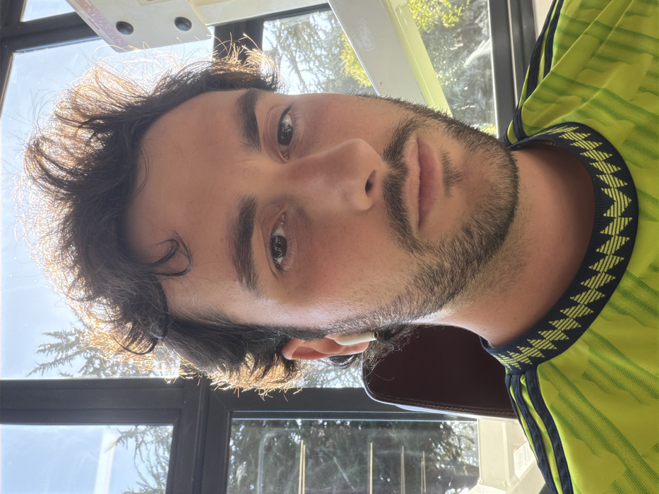 A man's close-up portrait displays his dark hair, styled with a slight wave and highlighted by sunlight. He has brown eyes and a neatly trimmed beard. He wears a yellow and green patterned shirt with dark stripes on the shoulders. Behind him are window panes, suggesting an indoor setting with an outdoor view of greenery. He is wearing a white in-ear headphone.