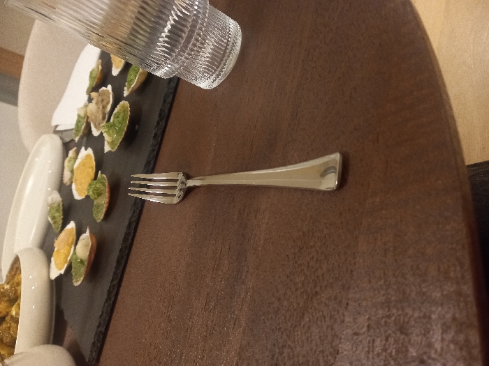A table holds a dark slate platter of appetizers, including filled pastry shells with diverse toppings. Beside the platter sits a white elongated dish containing what appears to be a sauce. Adjacent to the appetizers, a silver fork rests on the table. A glass of water stands near the platter's edge. The table has a dark, possibly wood-grain surface.