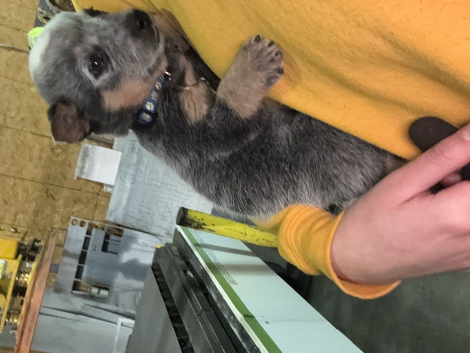 An indoor scene within an industrial workshop or manufacturing facility located in Ball Ground, United States, is depicted. The primary subject is a small puppy, characterized by mottled grey and tan fur, suggestive of a Blue Heeler breed. The puppy is wearing a blue collar adorned with white paw print patterns and a small, reflective bell. It is being held by an unseen individual, whose left arm and a portion of their upper torso, clad in a bright yellow/orange long-sleeved garment, are visible. The puppy rests against the person's chest, with its front paws on the yellow fabric, looking slightly off-camera to the right. In the background, to the left of the subjects, is a large piece of industrial machinery, featuring a white base with a green stripe and a dark, flat metal surface, likely a component of a metalworking operation such as a press or shear. A vertical yellow pole with dark smudges is situated between the person's arm and the machinery. Further behind, various metal sheets are visible, stacked and leaning against a wall, indicating material storage. Another piece of yellow industrial equipment is partially discernible in the upper background. The interior walls appear to be made of light-colored wood.
