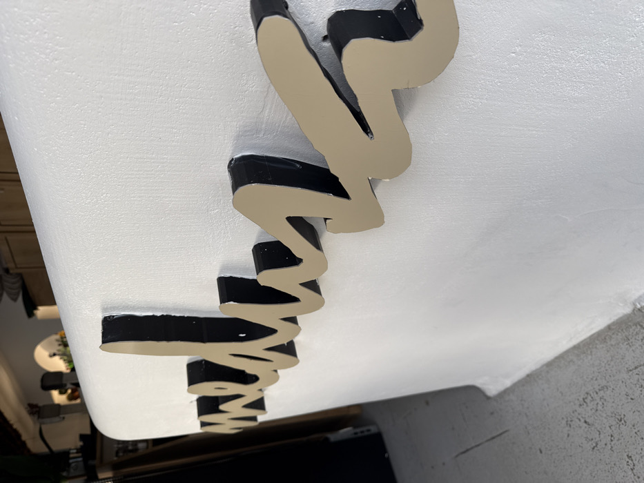 The image displays an upward-angled, close-up view of a wall-mounted sign in an indoor environment. The primary subject is a series of three-dimensional letters affixed to a textured white wall or partition. The letters are constructed with a black base layer and a reflective, light-beige or metallic-gold top surface, creating a raised, shadow-casting effect. The visible text, rendered in a flowing, lowercase script, reads "medusa" or a similar word, starting with 'm' on the left and extending rightwards. The white wall surface exhibits a coarse, possibly painted or stucco texture, with a visible rounded edge on the upper left. The background is out of focus, showing dark, indistinct elements on the far left, possibly part of a doorway or furniture, and further blurred shapes in the upper background. No individuals, specific actions, or interactions are depicted. The exact location within Petrovac na Moru, Montenegro, cannot be determined from the visual evidence presented.