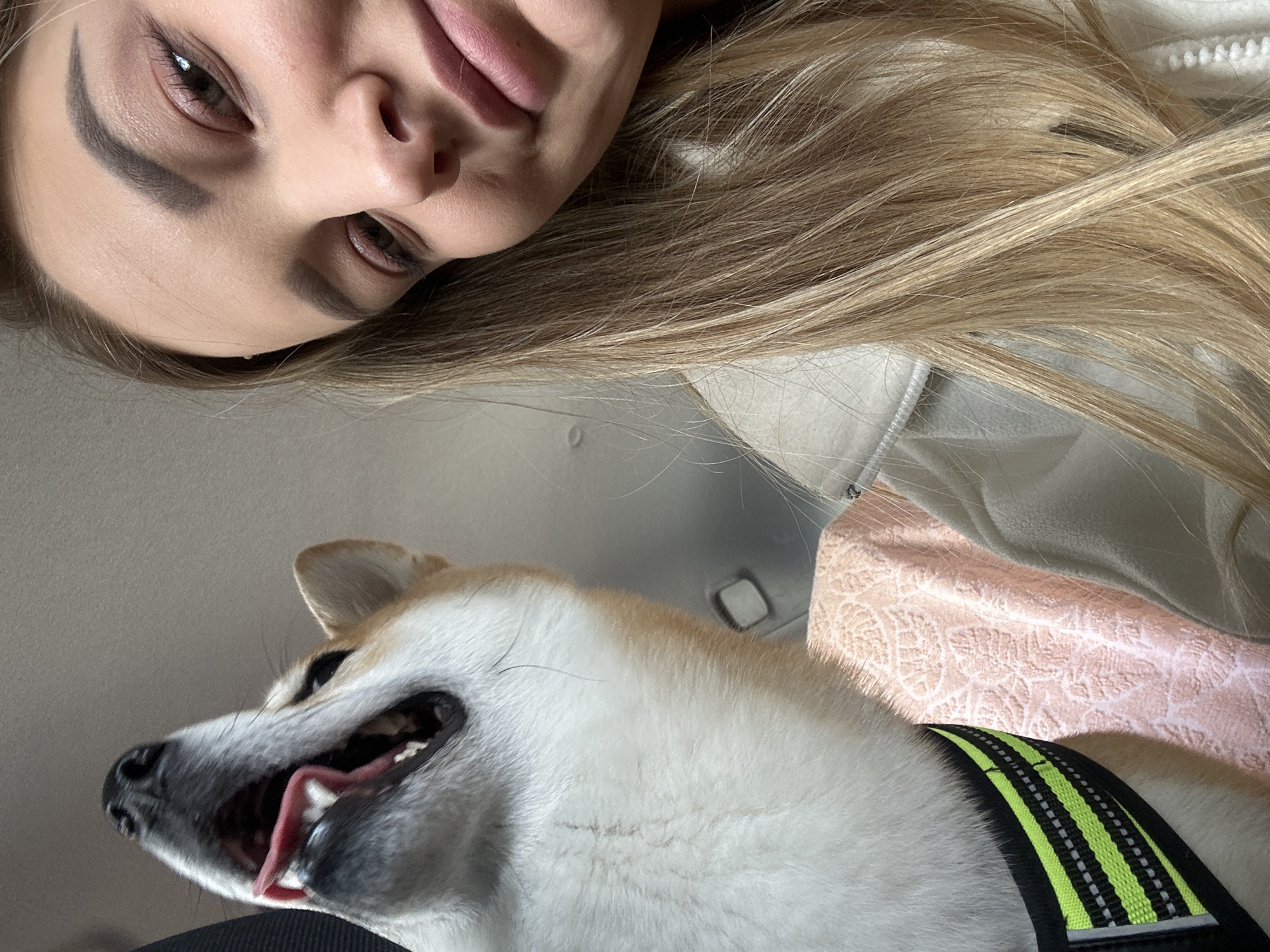 The image depicts an interior scene, likely within a vehicle. The specific location within Nikšić, Montenegro, is not discernible from the visual information provided. On the left and central portion of the frame, a Shiba Inu dog is visible from the chest up, characterized by light brown and white fur. The dog is wearing a black harness with prominent neon yellow and reflective gray stripes. Its mouth is open wide, with the tongue extended forward and curved upward, indicating panting or licking. On the right side of the frame, a female individual's face is partially visible, specifically her right eye, nose, mouth, and a portion of her cheek. She has light brown to blonde hair, which frames her face and extends downwards. Her right eye is open, and her lips form a subtle smile. In the mid-ground, below the dog and to the left of the female, a light peach-colored fabric with a subtle embossed floral or damask pattern is draped. The upper background shows a light gray or off-white surface, consistent with a vehicle's headliner. Lighting suggests an interior environment with ambient light, possibly from a window or sunroof.
