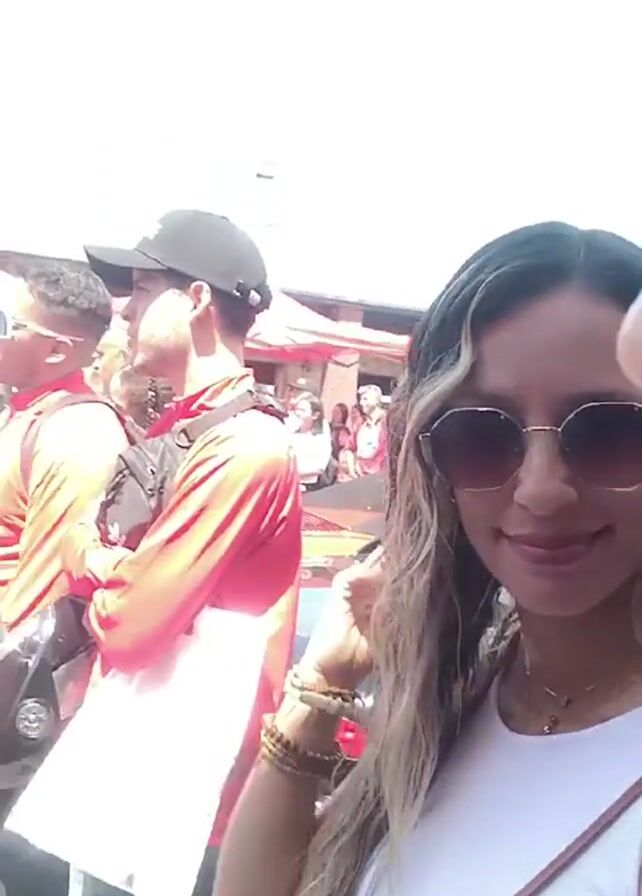 The video is a first-person perspective shot of a woman wearing sunglasses, a white top, and jewelry. She stands in a crowded outdoor area. The background shows many people, some wearing red shirts. There are tents and vehicles in the background. The camera moves slightly, capturing different people and objects as the woman adjusts her hair and smiles. Overall, the video depicts a lively outdoor event with a crowd of people.