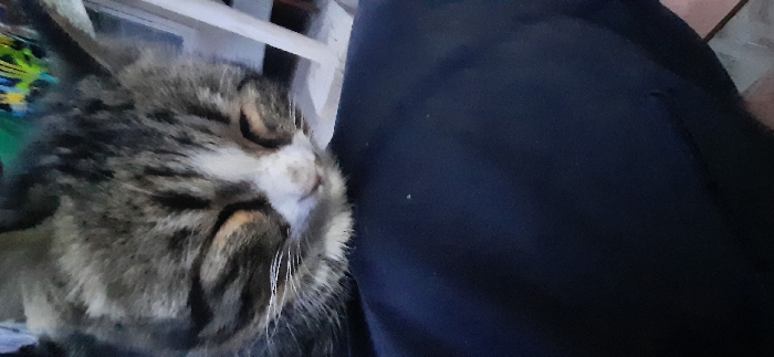 - "A domestic tabby cat is depicted resting, its eyes closed, positioned centrally on a dark blue fabric surface" by FM-0zE9q2, licensed under CC BY 4.0