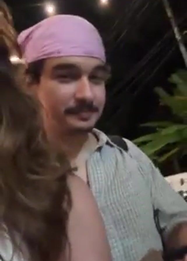 A man with a pink bandana and a mustache sticks his tongue out at the camera. He is wearing a light-colored button-down shirt and there are string lights behind him. A woman with long brown hair is standing next to him. The camera tilts downward, showing the woman's torso, clad in a white sports bra and black pants. The camera continues to move downwards until it shows the concrete ground. A bicycle is in the background.