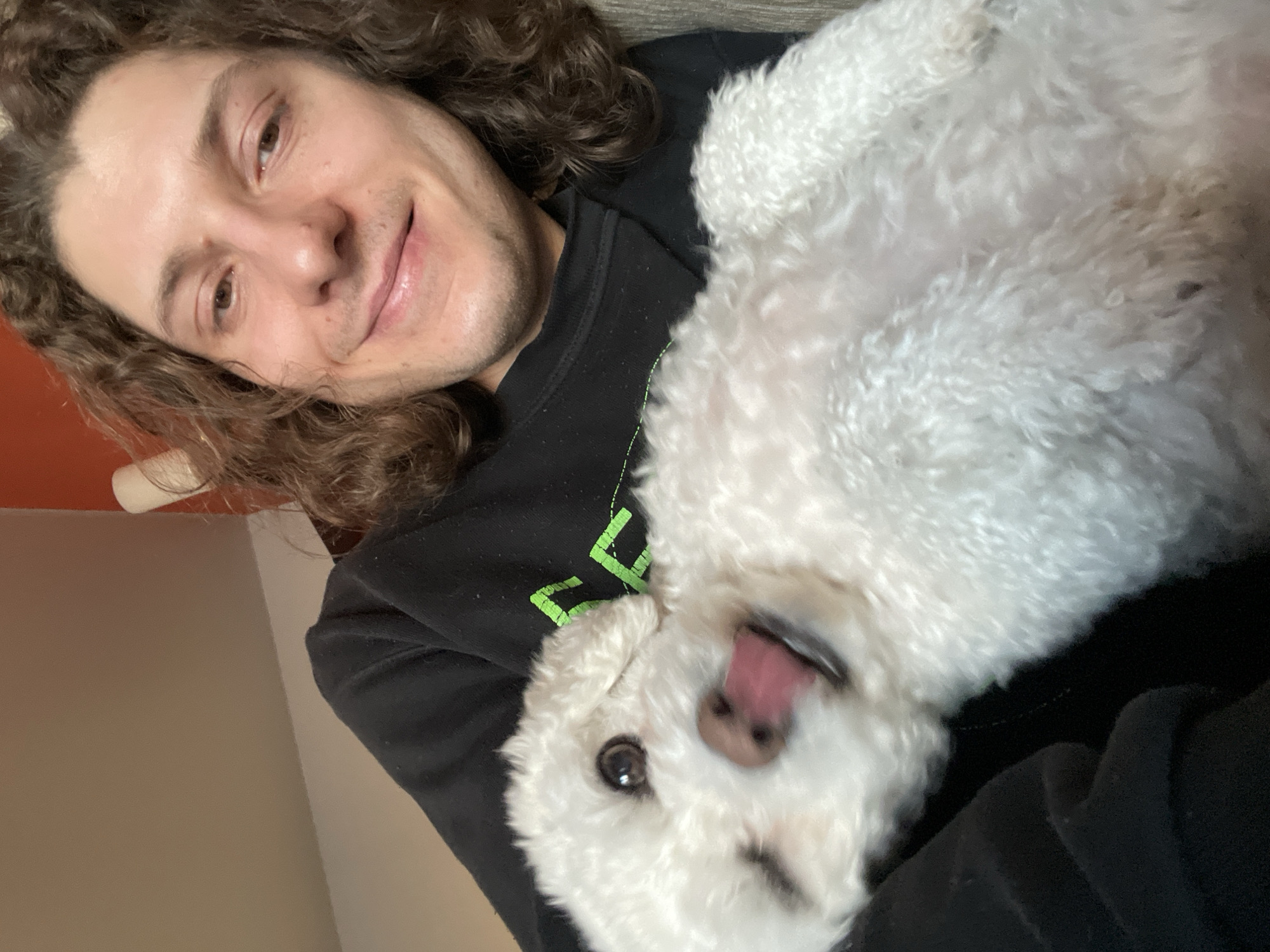 A man with long, curly brown hair is smiling and taking a selfie with a small, white, fluffy dog