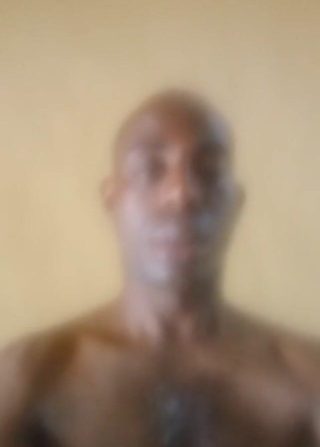 A blurred, shirtless man with a dark complexion stands against a yellow wall. His head is bald, and his face is obscured, though his nose and mouth are discernible.