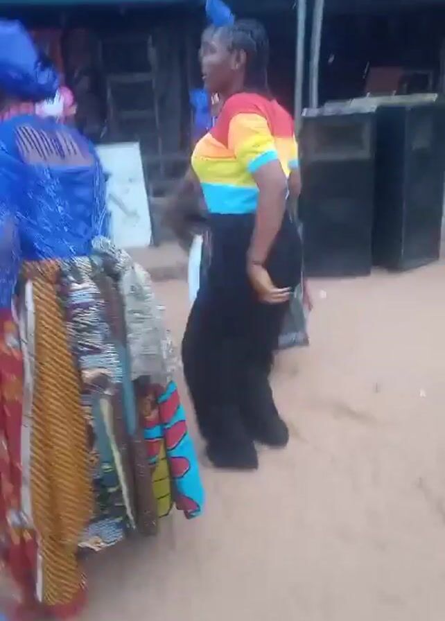 several African women dancing outdoors in front of a supermarket called "Chukwuebuka Supermarket". Some women are wearing blue outfits with headwraps, while one wears a rainbow-striped shirt and black pants. They appear to be enjoying themselves and dancing to music. One of the women has a broom. The ground is sandy, and there are speakers visible in the background.